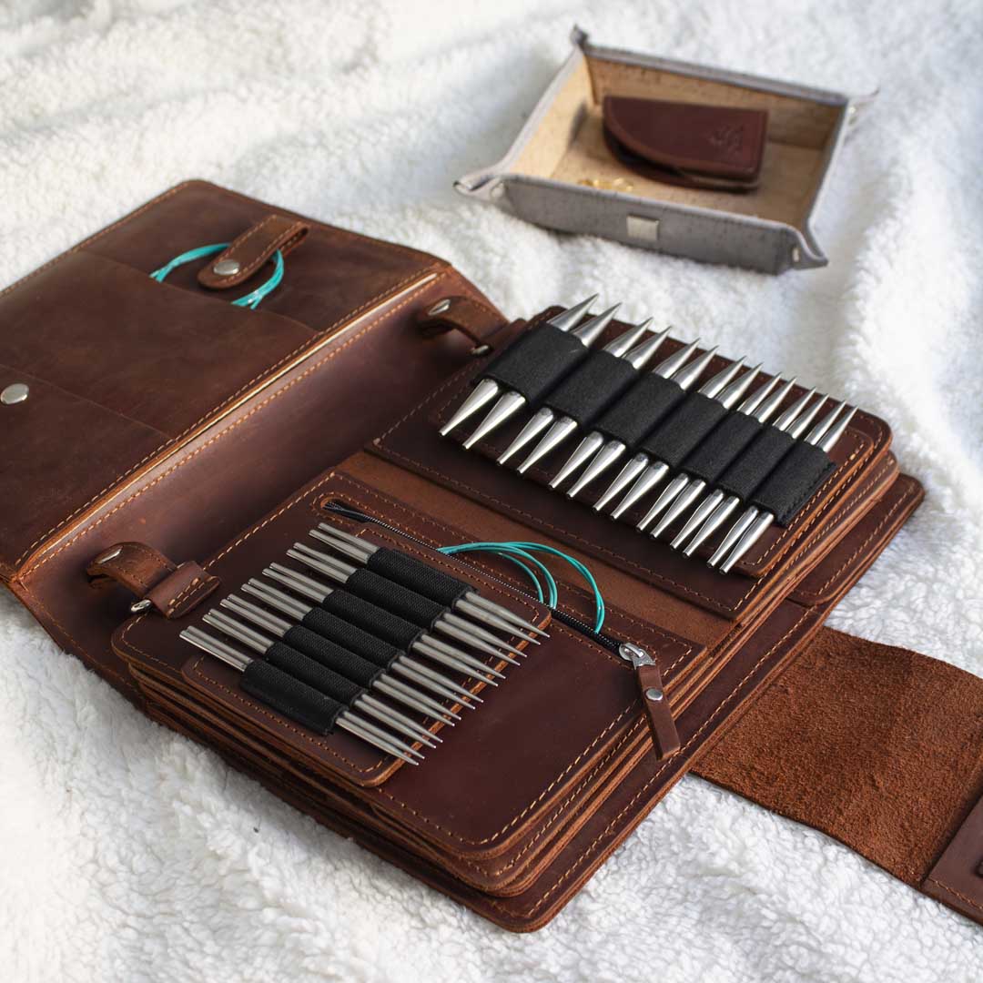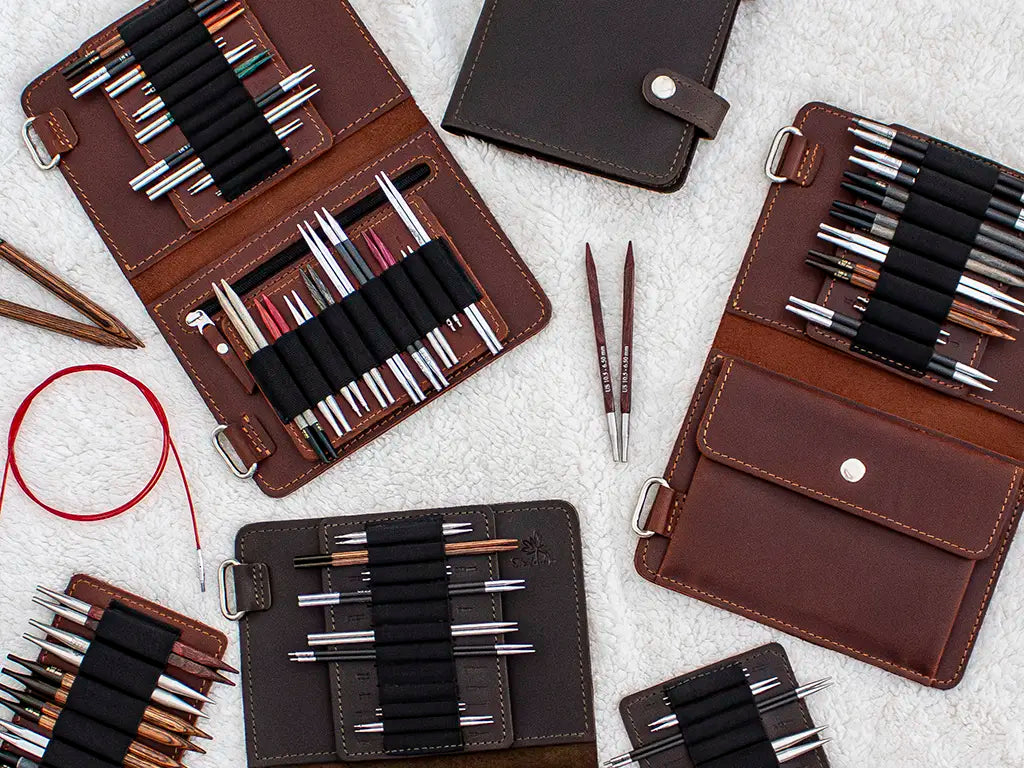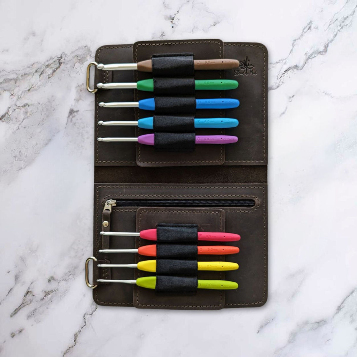 These cases are both versatile and portable, folding in half with rotating snaps to a compact size. They also lay flat with the closure snaps neatly tucked, to be inserted as a page into the Needle or Crochet Binder, to keep your specially designed page together with the rest of your needles & hooks collection. Another neat features is they can also be folded backwards and made to stand.