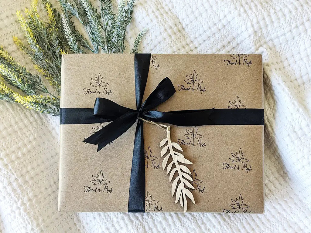We take care to minimize waste, so we opted for eco-friendly kraft paper, topped with a natural wood ornament and silky ribbon in classic black that can be easily reused. Kraft paper is bio-based, biodegradable, recyclable, and compostable, for a surprise without compromise :)