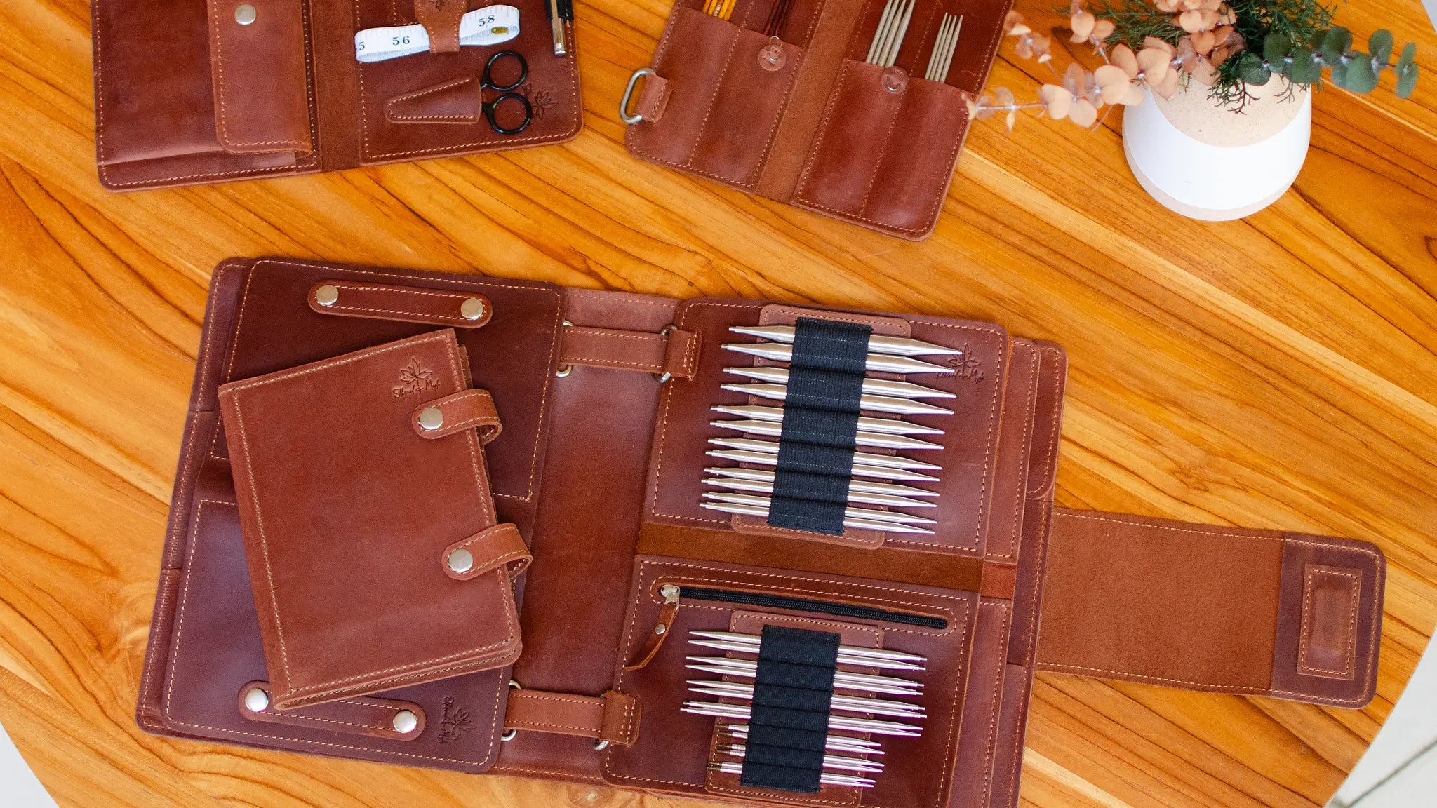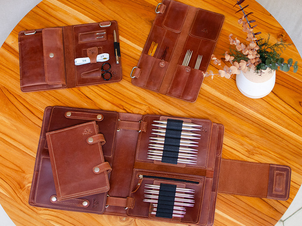 Unit price perThis handmade leather case is ideal for storing everything you need for your work-in-progress. It has specialized pockets for your fixed circulars, interchangeables, & DPN's/ or you standard & steel crochet hooks. It also comes with a zip pocket for essential notions. It folds closed with rotating snaps as a standalone case to take on the go, or can be neatly stored in the Needle Binder together with the rest of your needles.