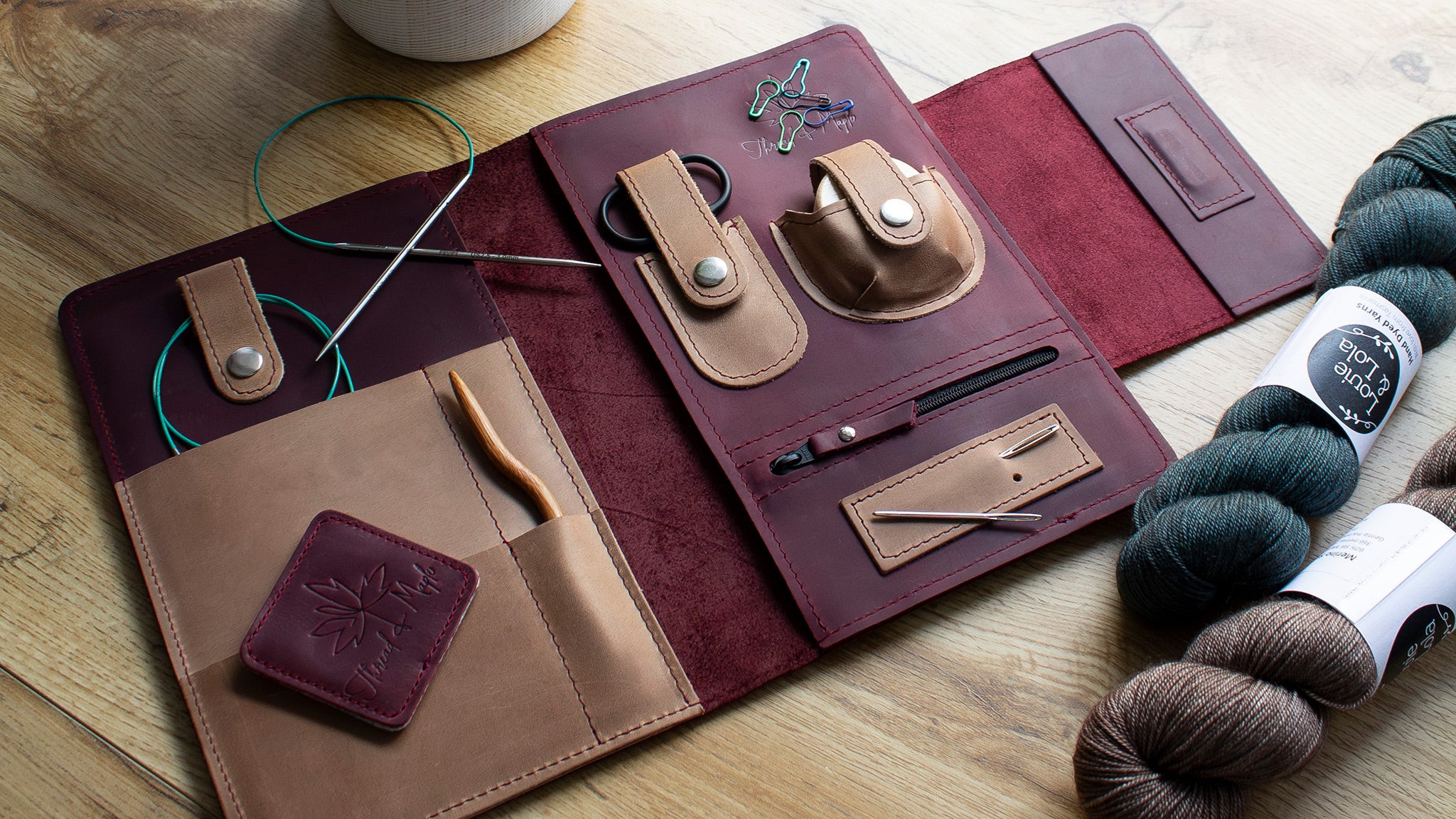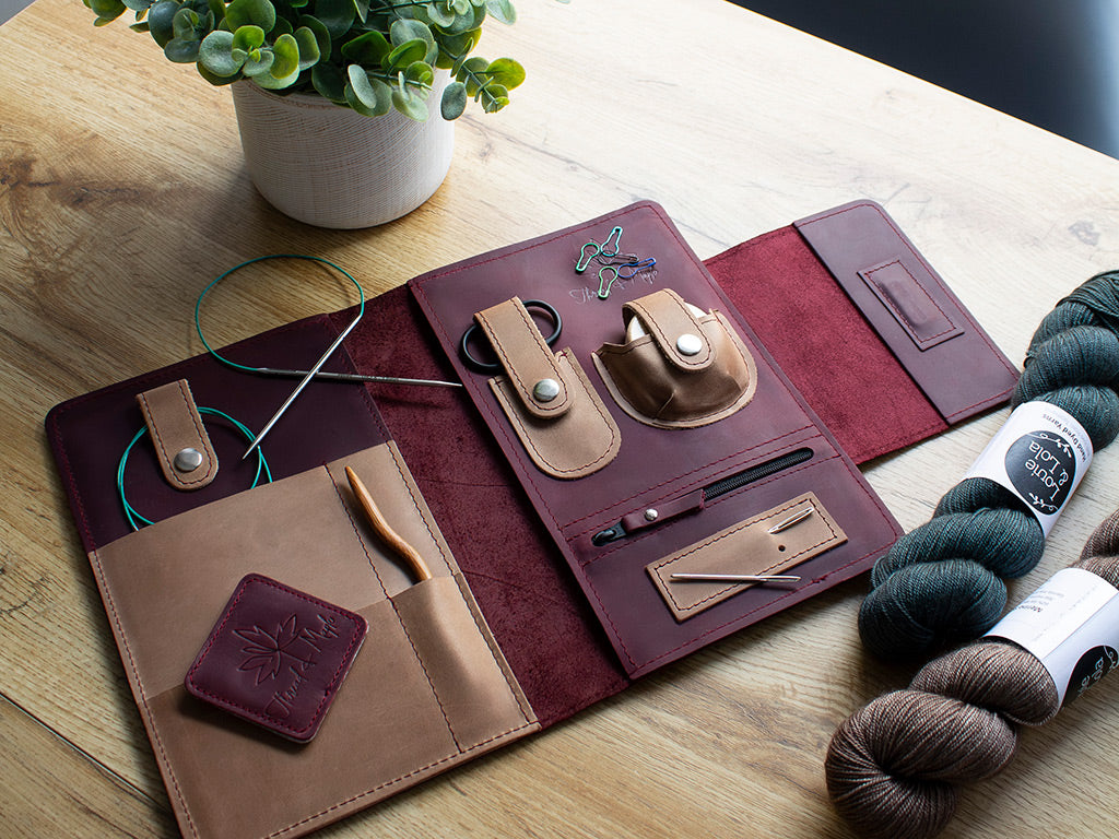 Leather knitting organizer with tools and yarn on a wooden table next to a small potted plant.