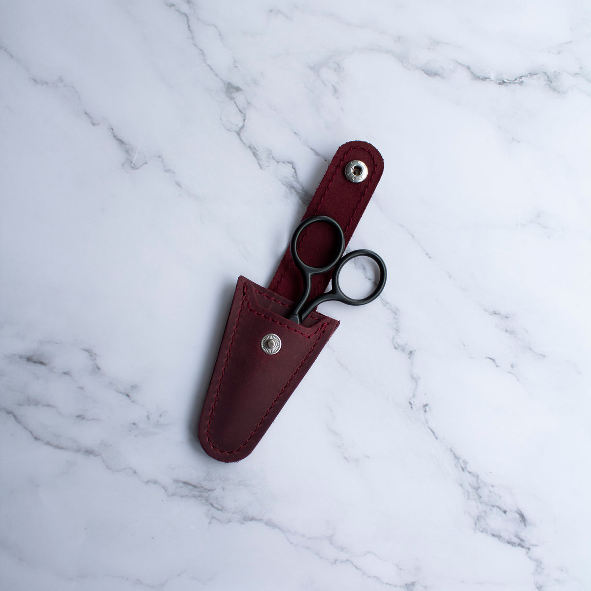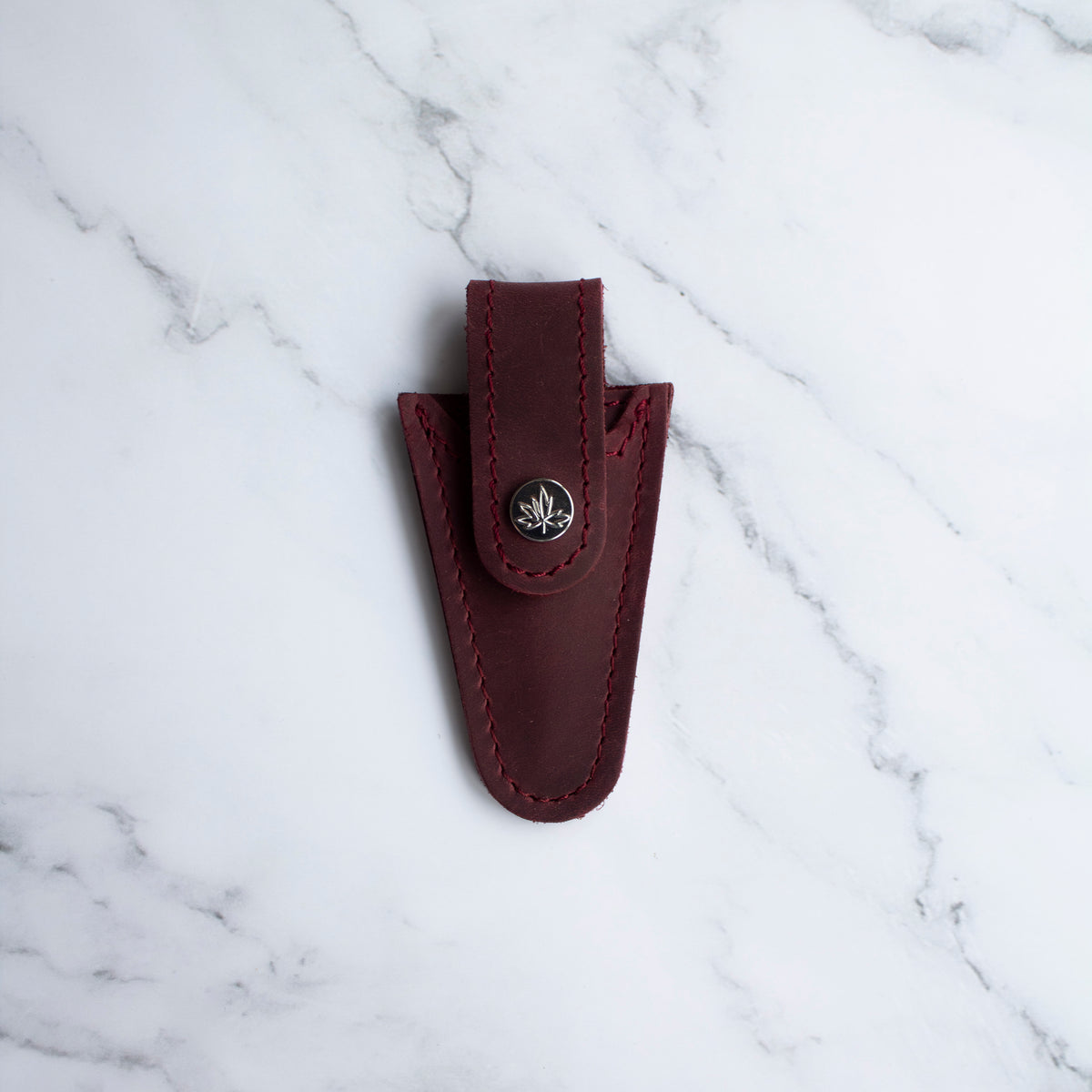 This case opens to a 5.5cm (2 1/4inch) mouth, tapering to the bottom. The top flap features a snap closure with the T&M leaf emblem engraved, ideal for safekeeping of small scissors.