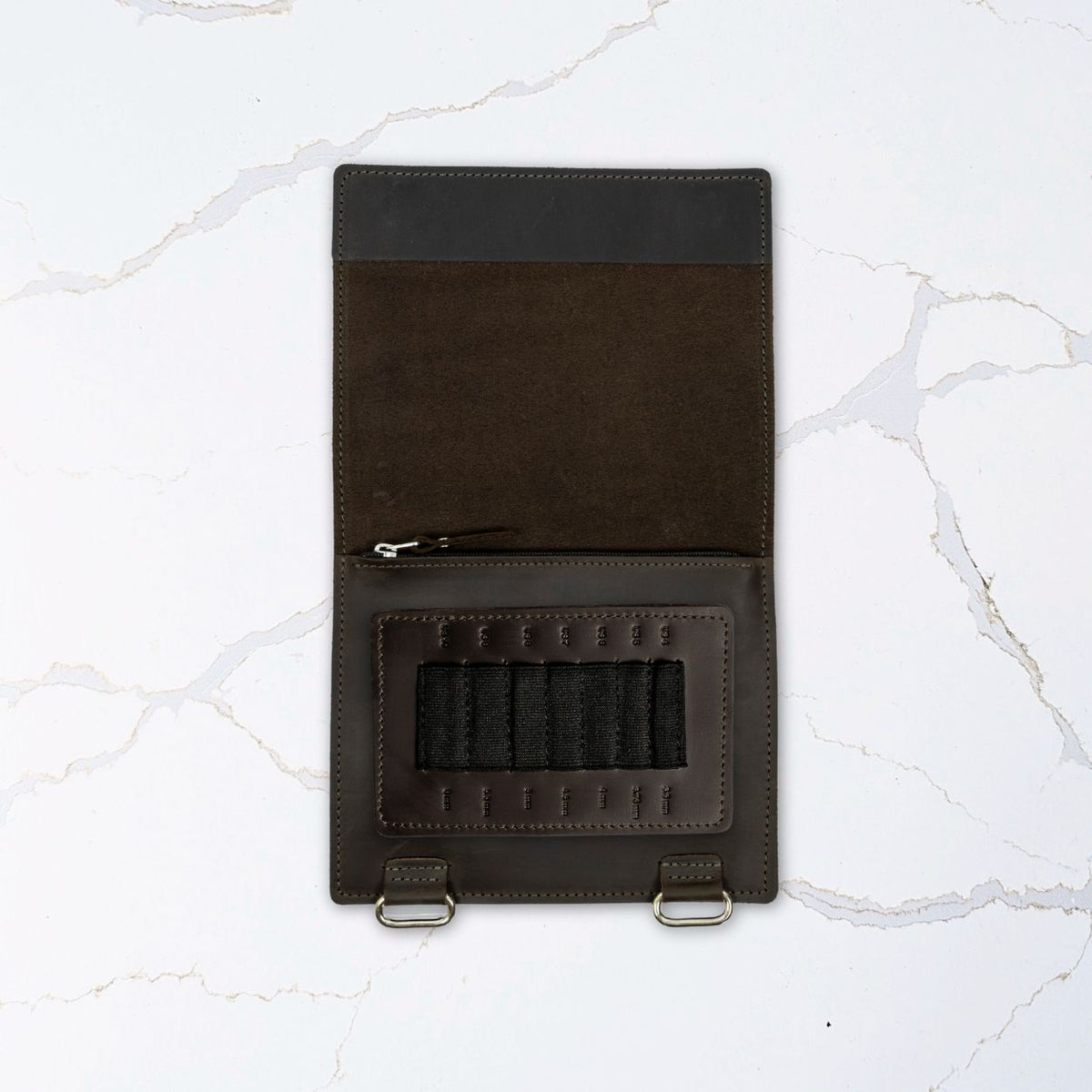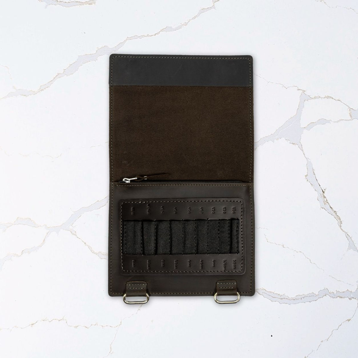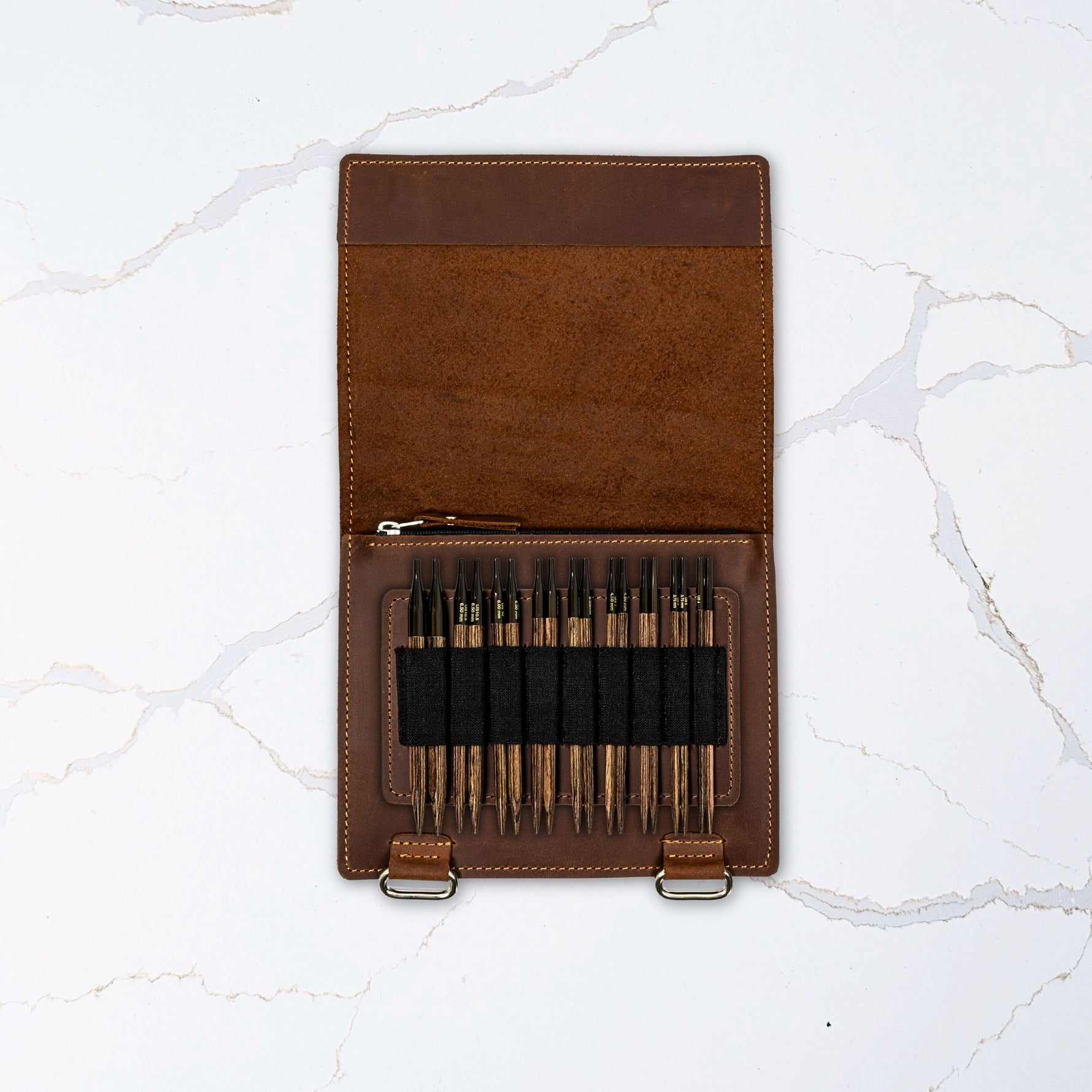 Inside, you’ll find an ample zippered pocket for cords, stoppers, connectors, and keys—or even an extra Velcro tab for more needles. A single Velcro tab with elastic loops holds your interchangeable needle tips snugly in place. It’s labeled with both US and metric sizes, and can be easily replaced as your collection evolves. All velcro tabs are interchangeable with our full-format Needle and Crochet Binder Pages, so you can easily shift your most-used tools to the Mini Binder when crafting on the go. Thoughtfully designed and made to last, it’s a flexible, travel-friendly storage solution that grows with you.
