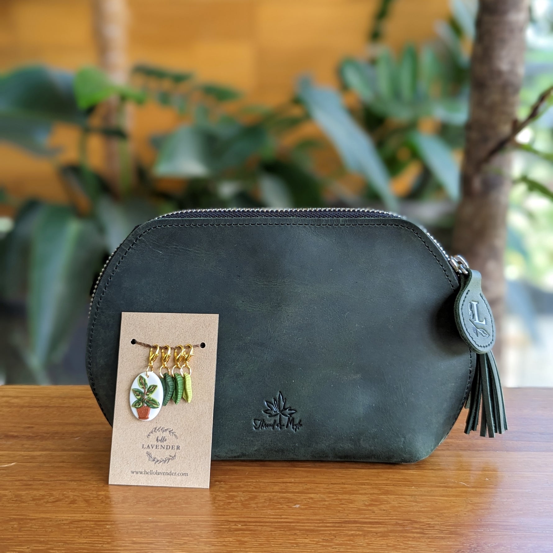 - A T&M new Leather Notions Zip in a limited edition rich dark green colour, with two zips for an ultra-wide opening. The pouch features the Hello Lavender emblem embossed on one of the zip pulls