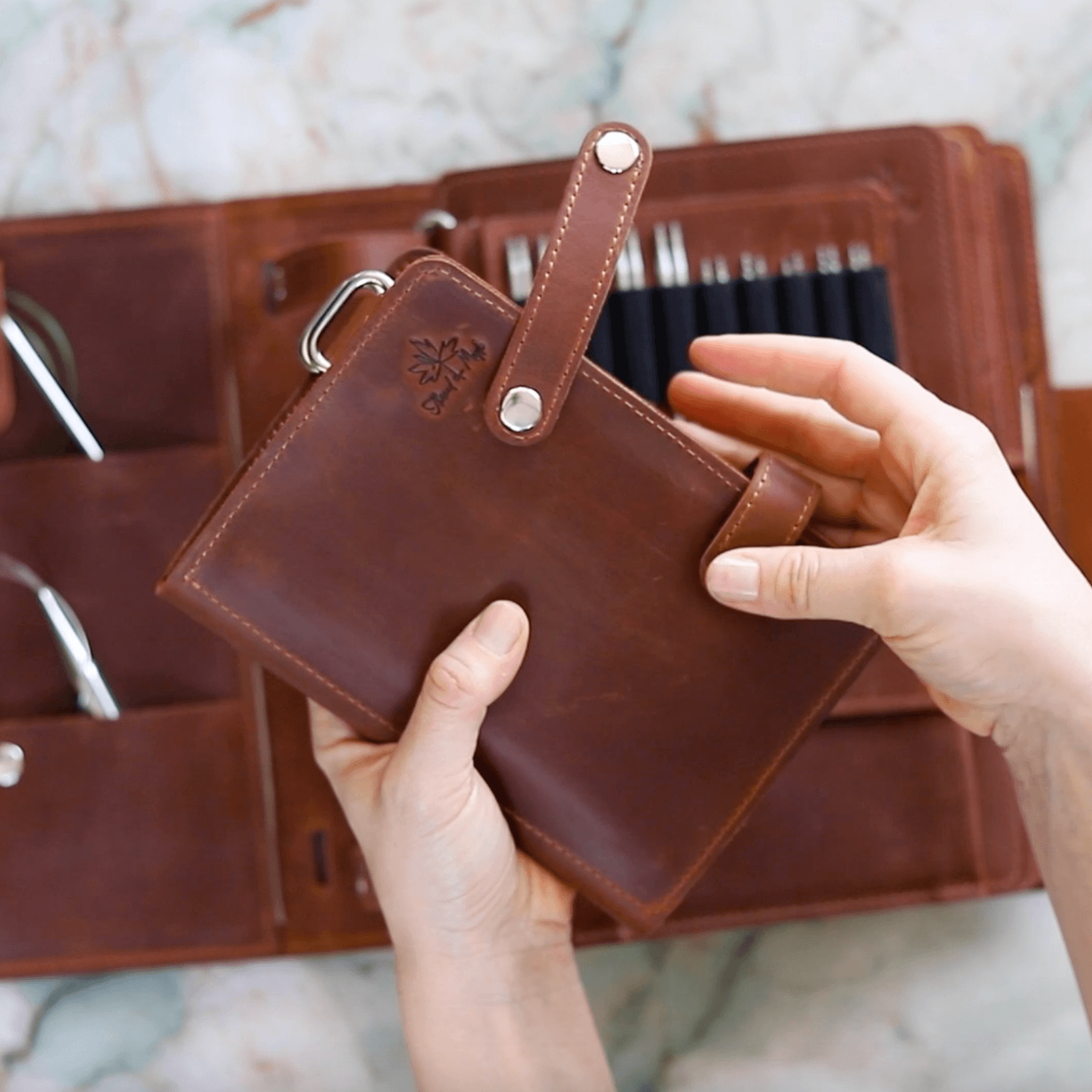 Handcrafted in Ukraine from soft, genuine leather, this binder is a beautiful and functional heirloom piece designed to keep your knitting tools organized for years to come.