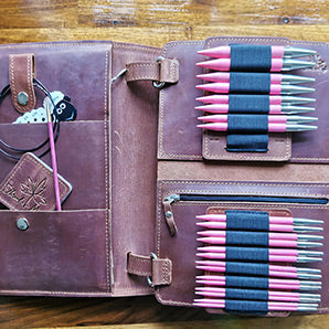 This elegant binder serves as the base for your own unique storage system. Simply choose from a variety of binder pages (sold separately) to organize different types of needles, notions, and crochet hooks. The pages easily snap in and out of the binder’s leather rings, allowing you to rearrange or take individual pages on the go. Click here to see available page options.
