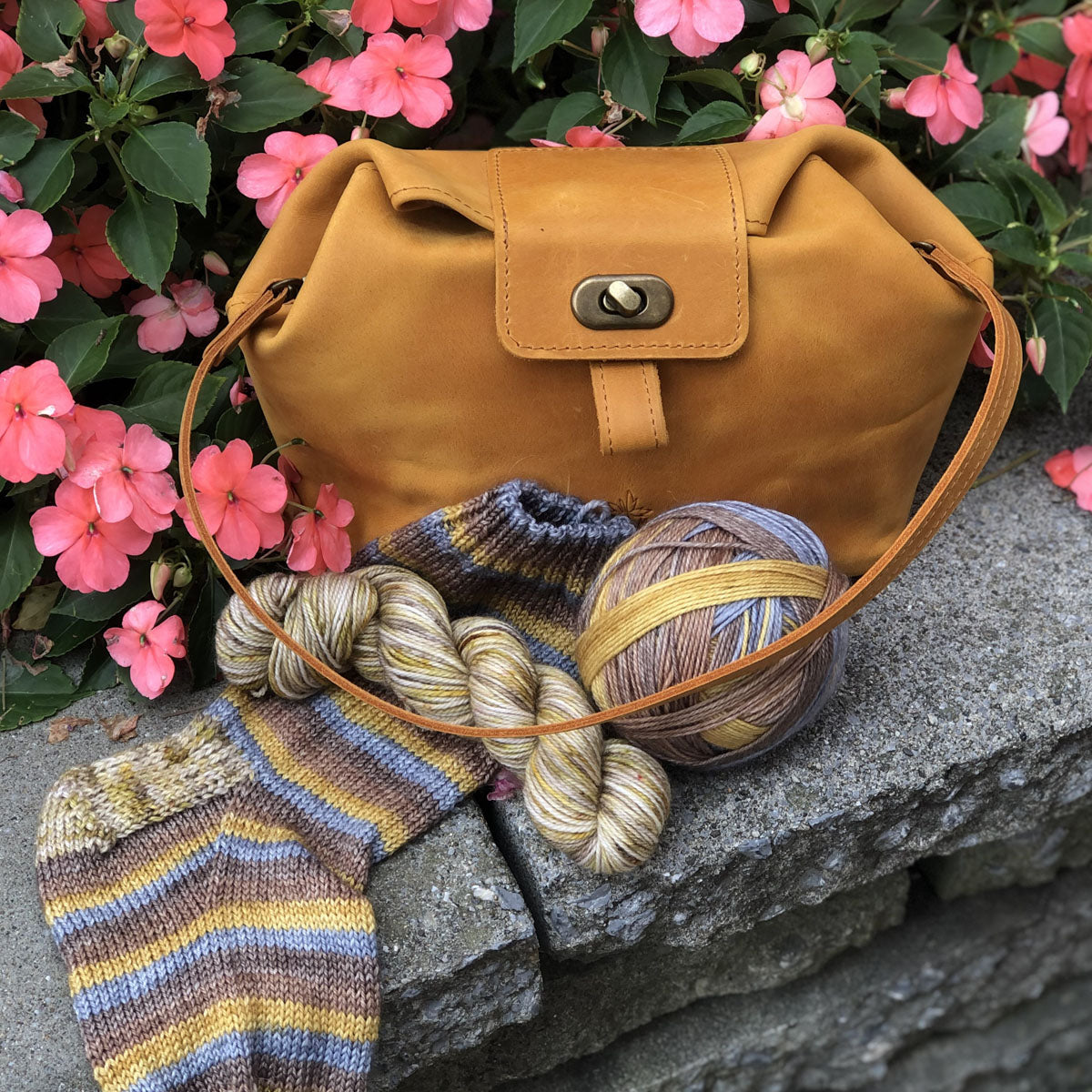 You'll love our new Leather Pop Up Bag because it sits flat and opens wide at the top, perfect for quickly picking up and dropping in your work-in-progress projects. We designed this bag for 1-2 skein projects like socks, mittens, hats, and cowls. The top folds over and cinches with a brass metal twist lock for a secure close. When opened, it pops up and sits open like a bucket bag with a single wide opening.
